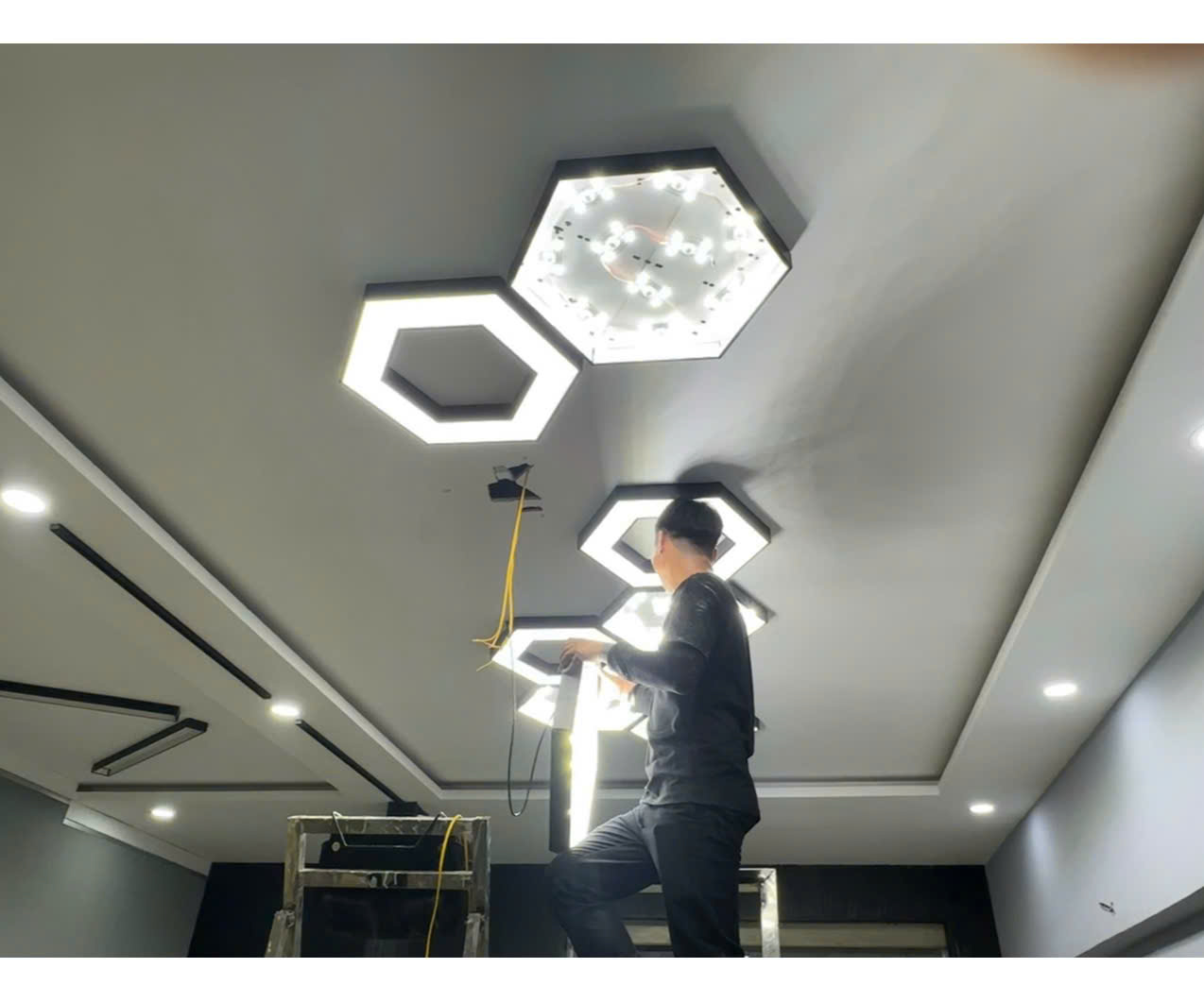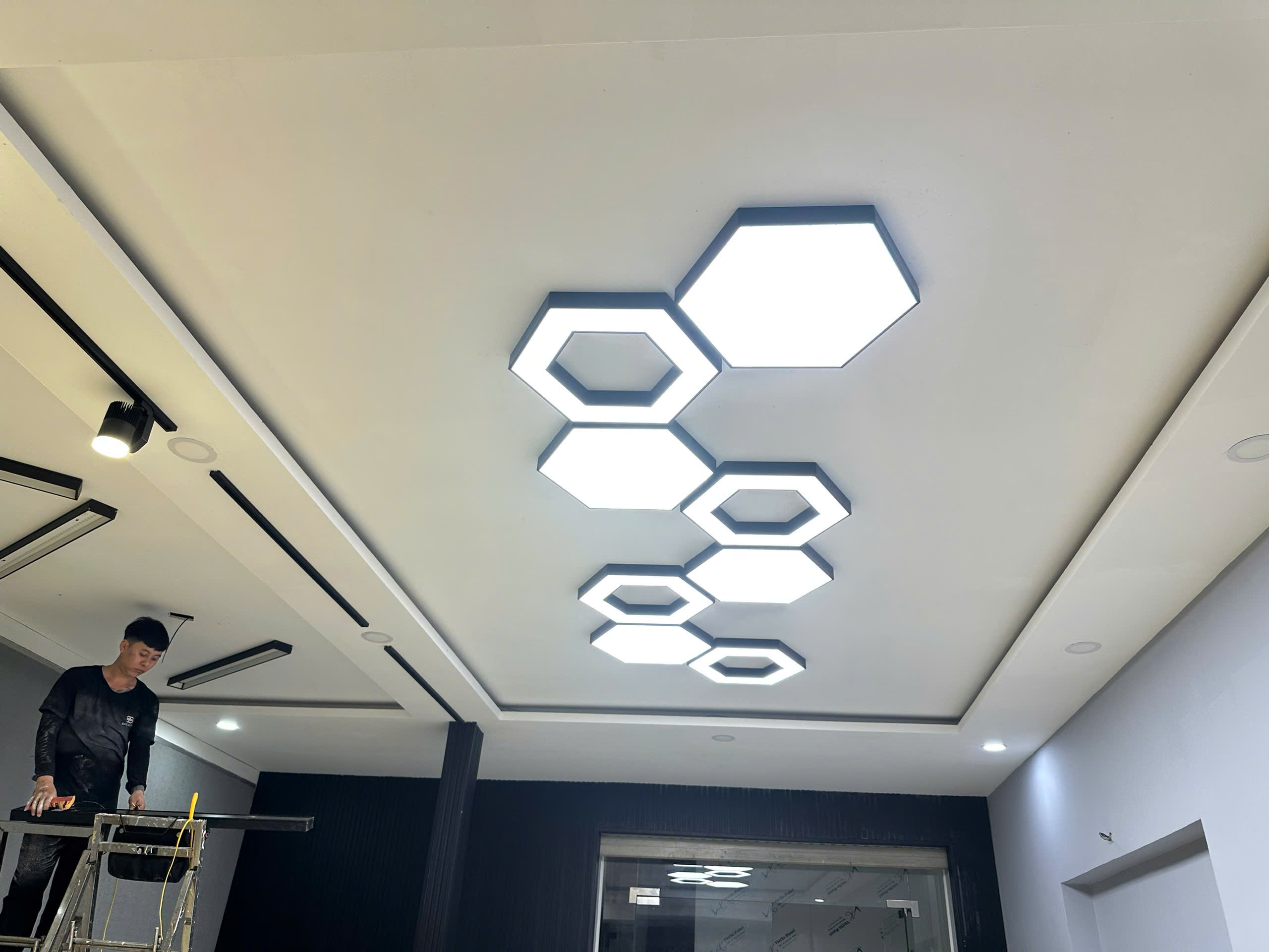 Đèn thả văn phòng lục giác là một loại đèn trang trí hiện đại, được thiết kế đặc biệt để sử dụng trong không gian làm việc như văn phòng, phòng họp, coworking space hoặc showroom. Dưới đây là mô tả chi tiết về loại đèn này: