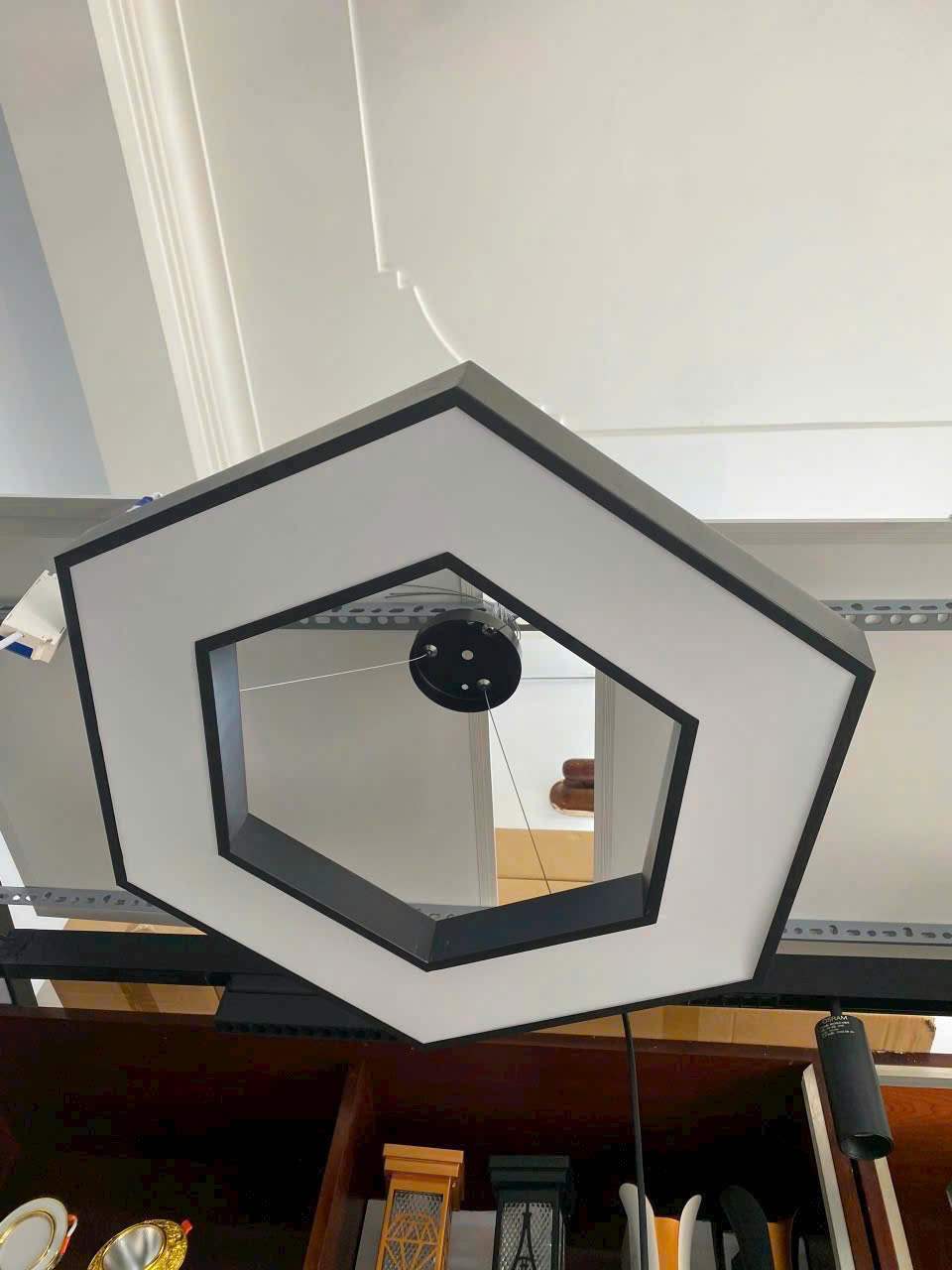 Đèn thả văn phòng lục giác là một loại đèn trang trí hiện đại, được thiết kế đặc biệt để sử dụng trong không gian làm việc như văn phòng, phòng họp, coworking space hoặc showroom. Dưới đây là mô tả chi tiết về loại đèn này: